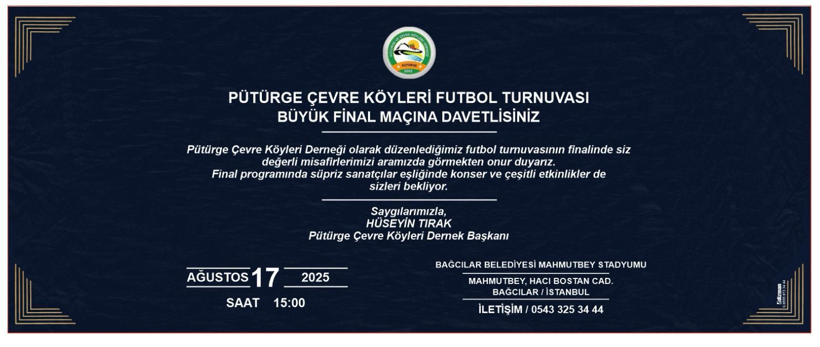 Turnuva ile ilgili paylaşım yapan Pütürge Çevreköyleri Derneği Başkanı Hüseyin Tırak, “PÜTÜRGEMİZİN GÜZİDE TAKIM BAŞKANLARI BİLDİĞİNİZ ÜZERE ÇEVRE KÖYLERİ DERNEĞİ OLARAK DÜZENLEDİĞİMİZ FUTBOL TURNUVAMIZIN 17 AĞUSTOS PAZAR GÜNÜ SAAT 16:00’da BAĞCILAR MAHMUTBEY STADYUMUNDA ASLANKENT VE NOHUTLU FİNAL MAÇI VE MAÇ ÖNCESİ PROGRAMIMIZ VAR ALLAH NASİP EDERSE SİZLERİ DE PAZAR GÜNÜ YANIMIZDA GÖRMEKTEN MUTLULUK DUYACAĞIZ SELAM VE DUA İLE KALIN